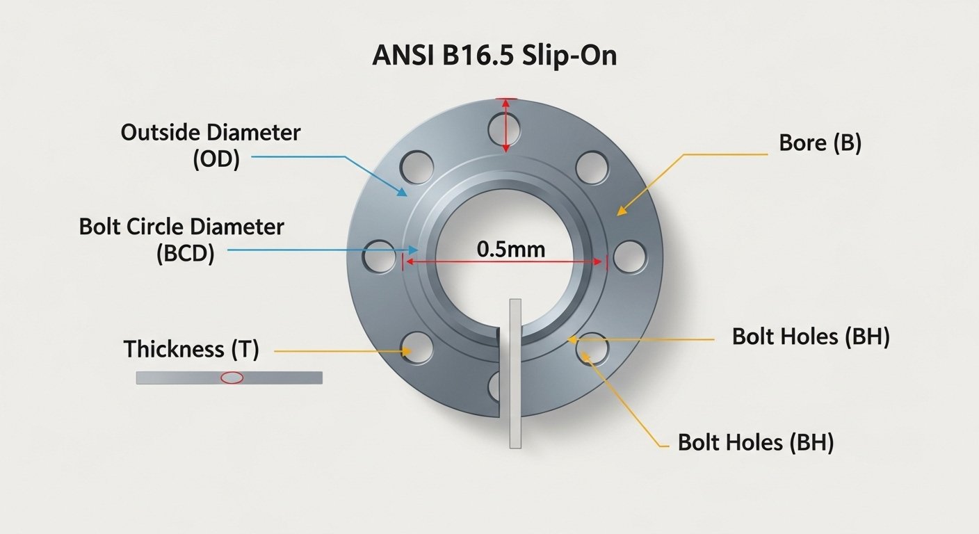 - Bore (B): The inner diameter of the flange, which must match the pipe’s inner diameter for a smooth flow.